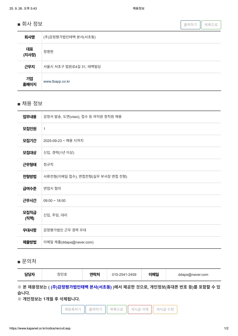 (주)감정평가법인태백 본사(서초동) 평가사 모집