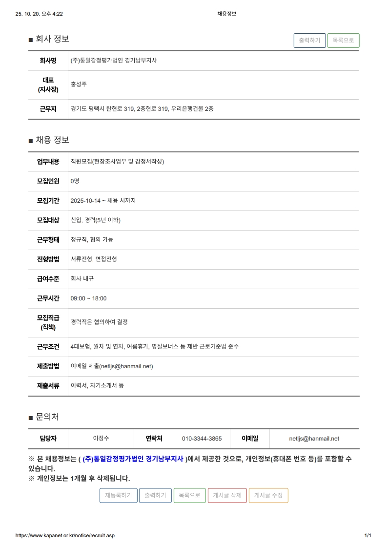 (주)통일감정평가법인 경기남부지사 평가사 모집