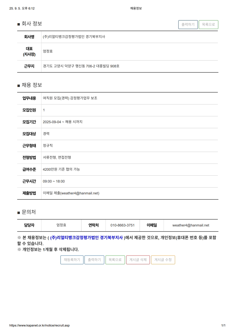 (주)리얼티뱅크감정평가법인 경기북부지사 평가사 모집