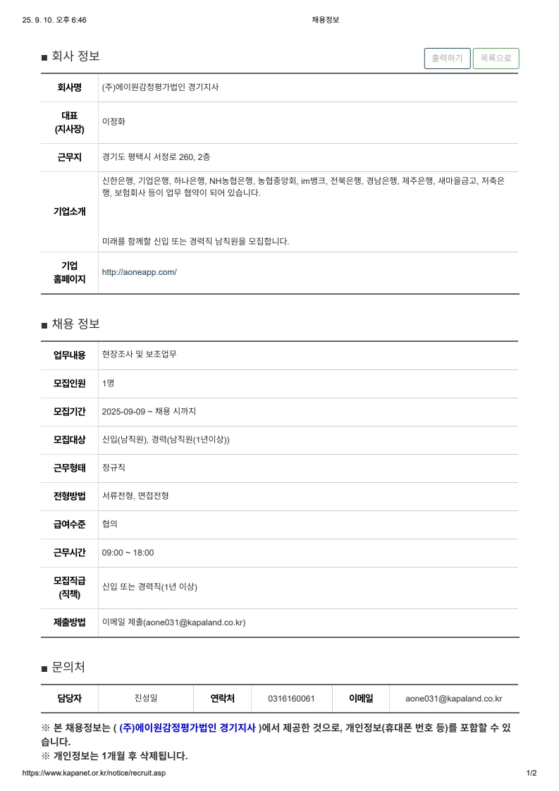 (주)에이원감정평가법인 경기지사 평가사 모집