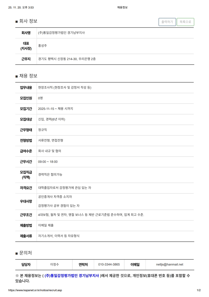 (주)통일감정평가법인 경기남부지사 평가사 모집