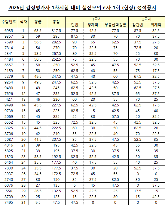 26년대비 감정평가사 1차시험 대비 실전모의고사 1회(현장) 성적공지