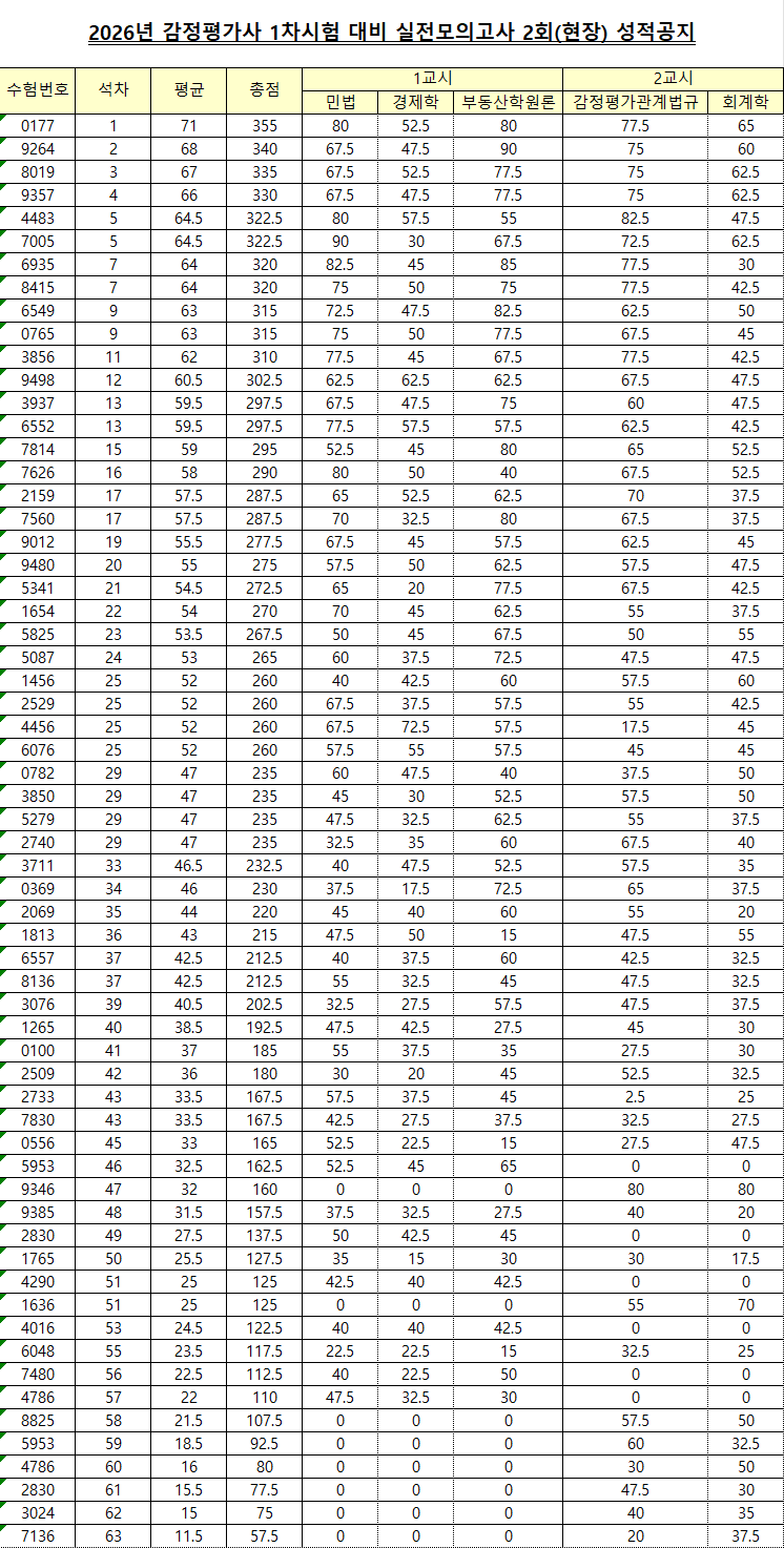 26년대비 감정평가사 1차시험 대비 실전모의고사 2회(현장) 성적공지